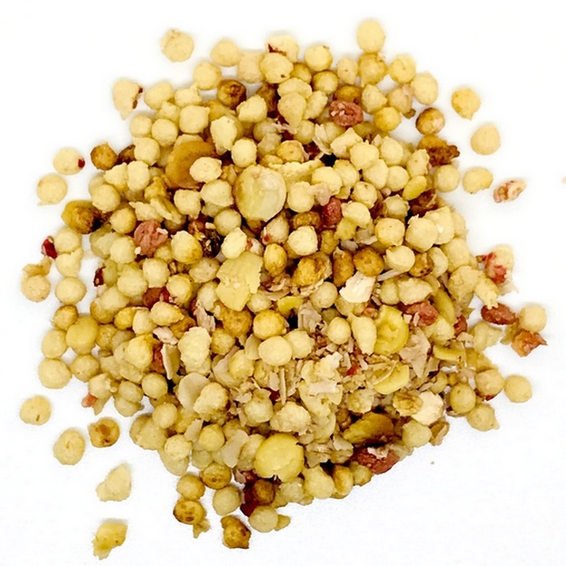 soja eiwit crisps; sojavlokken; soja proteïne; glutenvrije havervlokken; appel- en wortelextracten; zonnebloemolie; 4,3% aardbei poeder; aroma’s; rode bietenpoeder met rijst crisps; granaatappelsap concentraat.