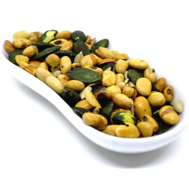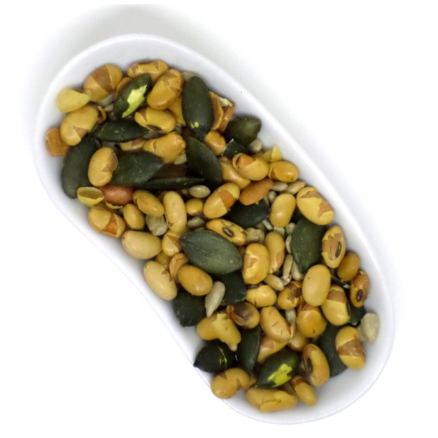 59% geroosterde sojabonen; 19% geroosterde pompoenzaden; 19% zonnebloem zaden; zeezout.